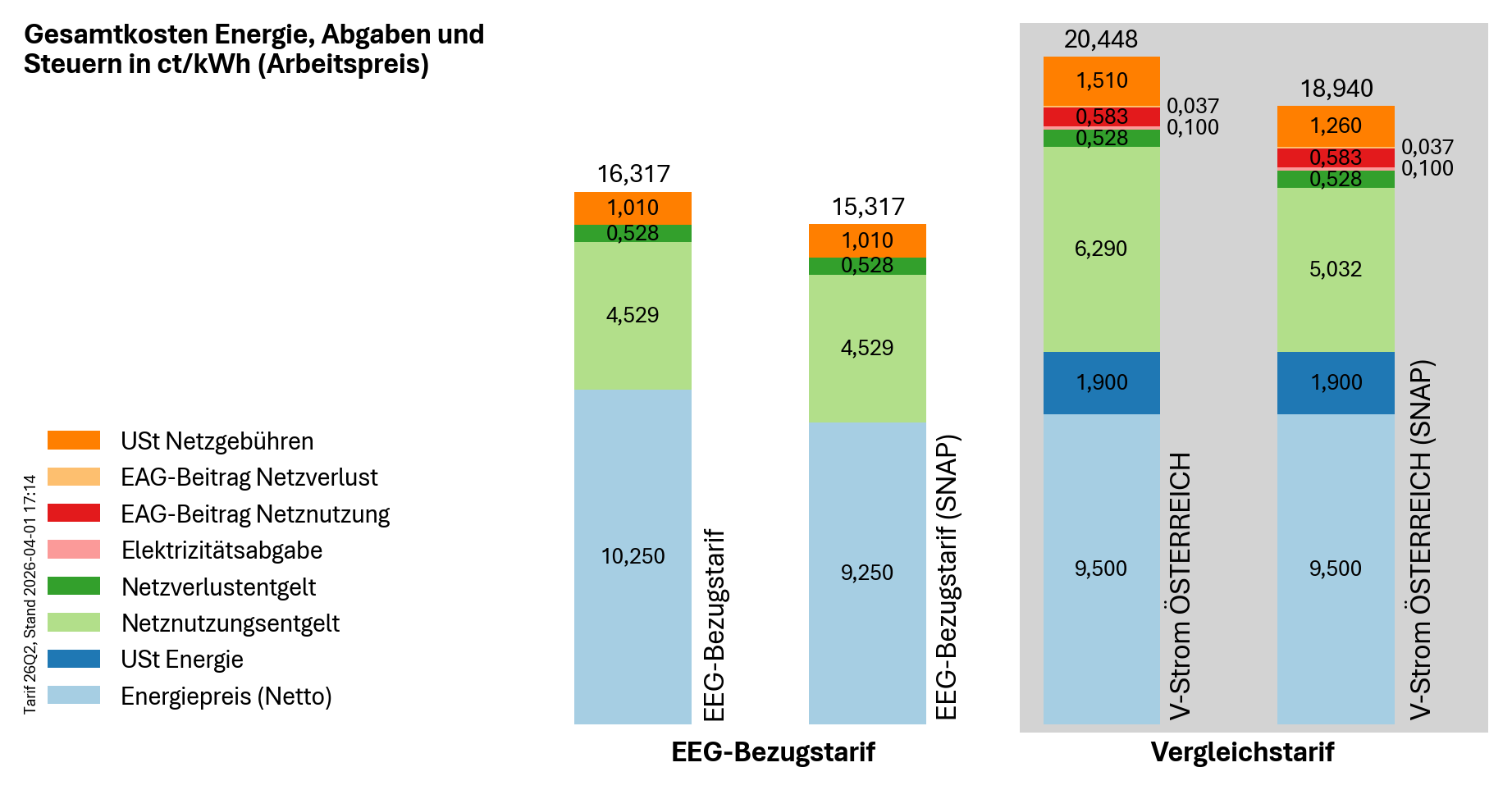 Die Gesamtkosten für jede von der EEG bezogene kWh Energie belaufen sich aktuell (Tarif 26Q2) auf 16,317 ct/kWh bzw. 15,317 ct/kWh. Diese beinhalten neben den Energiekosten die reduzierten verbrauchsbezogenen Netzentgelten und Abgaben in Höhe von 6,067 ct/kWh (inkl. 20% USt).
